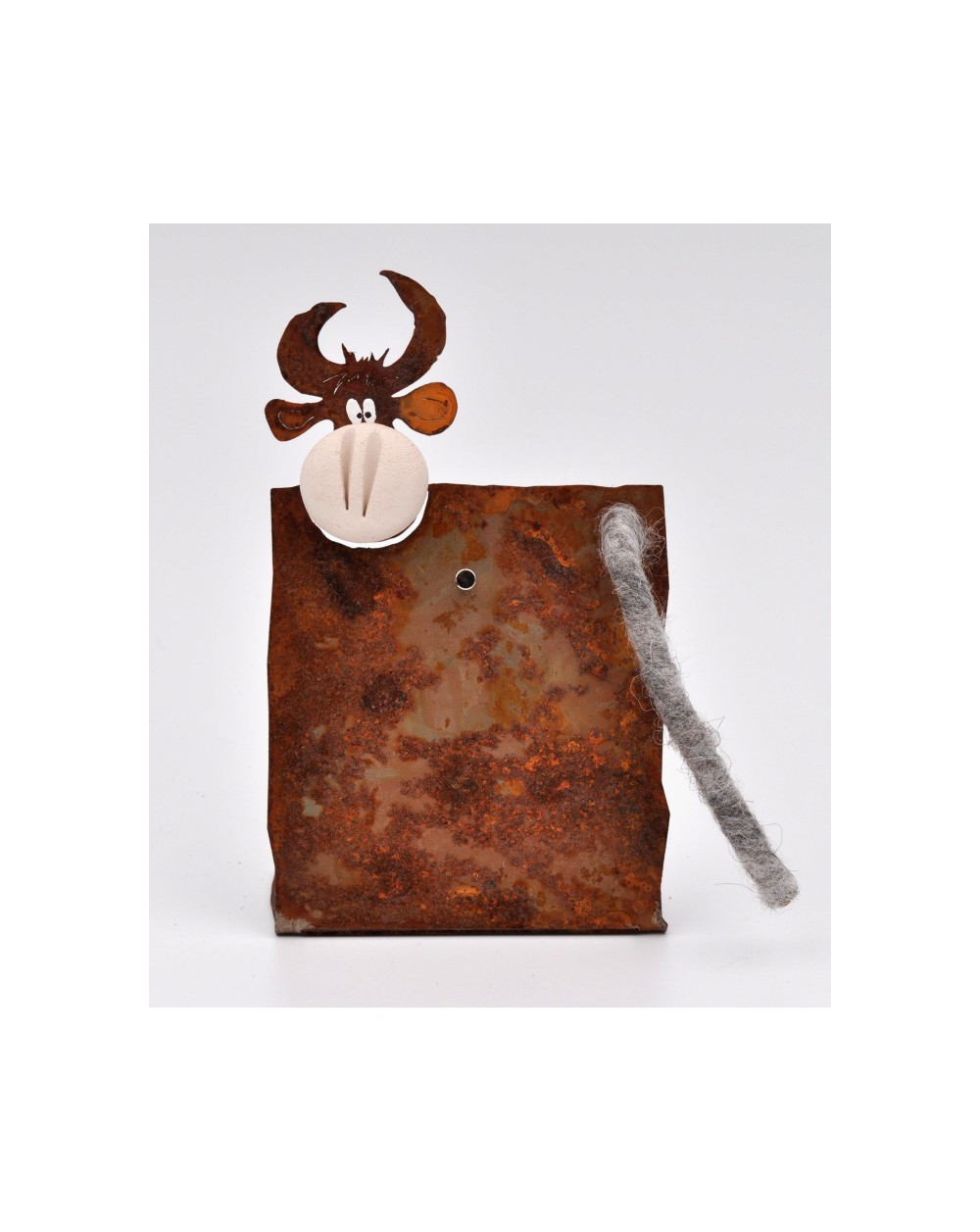 Vache métallique Ferdinand PETITE avec aimant pour fixer photos ou cartes de visite, avec nez beige en céramique