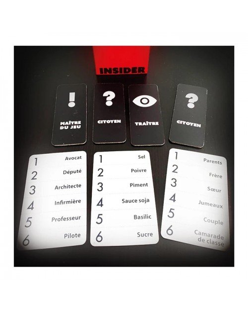 Idée du jeu : Des cartes rôles sont distribuées aléatoirement pour 4 à 8 joueurs, désignant un maitre du jeu, un Insider (traitre), tous les autres joueurs sont d'honnêtes citoyens. Le maitre de jeu doit faire deviner un mot désigné sur une carte secrète. Pendant un sablier d'environ 5 minutes, les joueurs lui posent un maximum de questions auxquelles il répond uniquement par "oui / non / je ne sais pas".