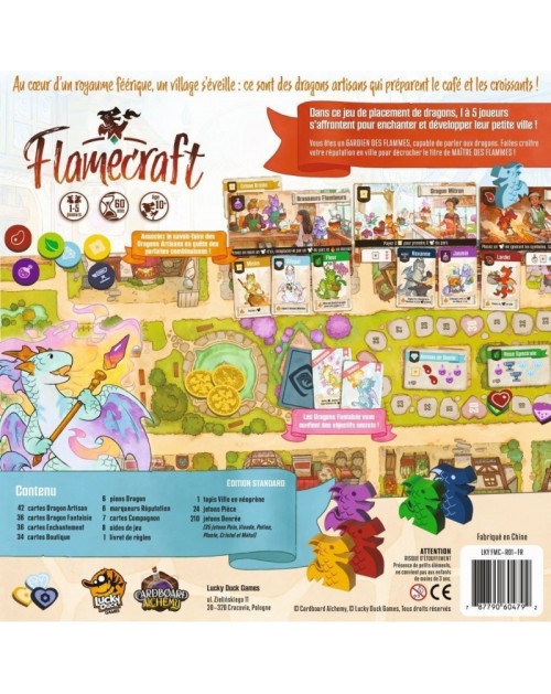 Idée du jeu : Les joueurs jouent le rôle des Gardiens des flammes, rassemblant des objets, plaçant des dragons et lançant des enchantements pour améliorer les boutiques de la ville. Les dragons sont spécialisés (pain, viande, fer, cristal, plante et potion) et les Gardiens des flammes savent quels magasins sont les meilleurs pour chacun d’eux. Visitez une boutique pour obtenir des objets et une faveur de l’un des dragons qui s’y trouve. Les objets collectés peuvent être utilisés pour enchanter une boutique, gagner en réputation et obtenir les faveurs de tous les dragons de la boutique. Si vous avez la chance d’attirer des dragons à la mode, vous aurez l’occasion de gagner encore plus de réputation!