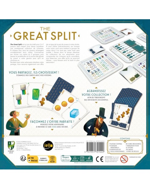 The Great Split est un jeu particulièrement malin qui associe Draft, Gestion, Opportunisme et Collection dans une ambiance art-déco très rafraîchissante et agréable à jouer. Un jeu idéal à découvrir pour les joueurs qui veulent s’investir dans une ambiance unique qui associe gestion et bluff léger, avec une mécanique de jeu palpitante actuellement en plein essor !