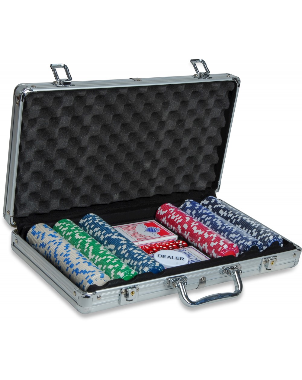 Contenu : Malette de Poker en alu avec 300 jetons en 4 couleurs, 2 jeux de cartes de 52 cartes, avec Joker, Dealer Button et 5 dés, chip 40 mm, 11.5 g.