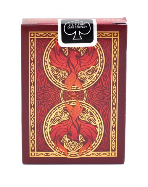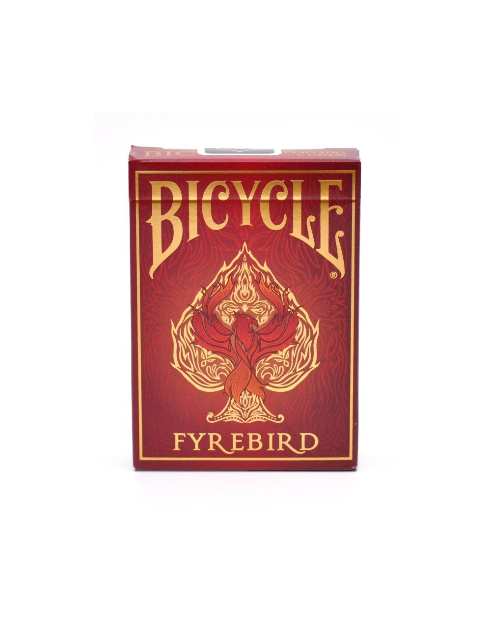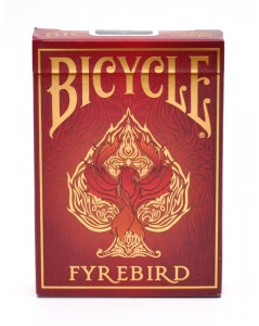 Idée des cartes : Le jeu Bicycle® Fyrebird séduit immédiatement par ses couleurs ardentes et son emballage en feuille d’or. Le dos a un design unique qui semble être en feu.