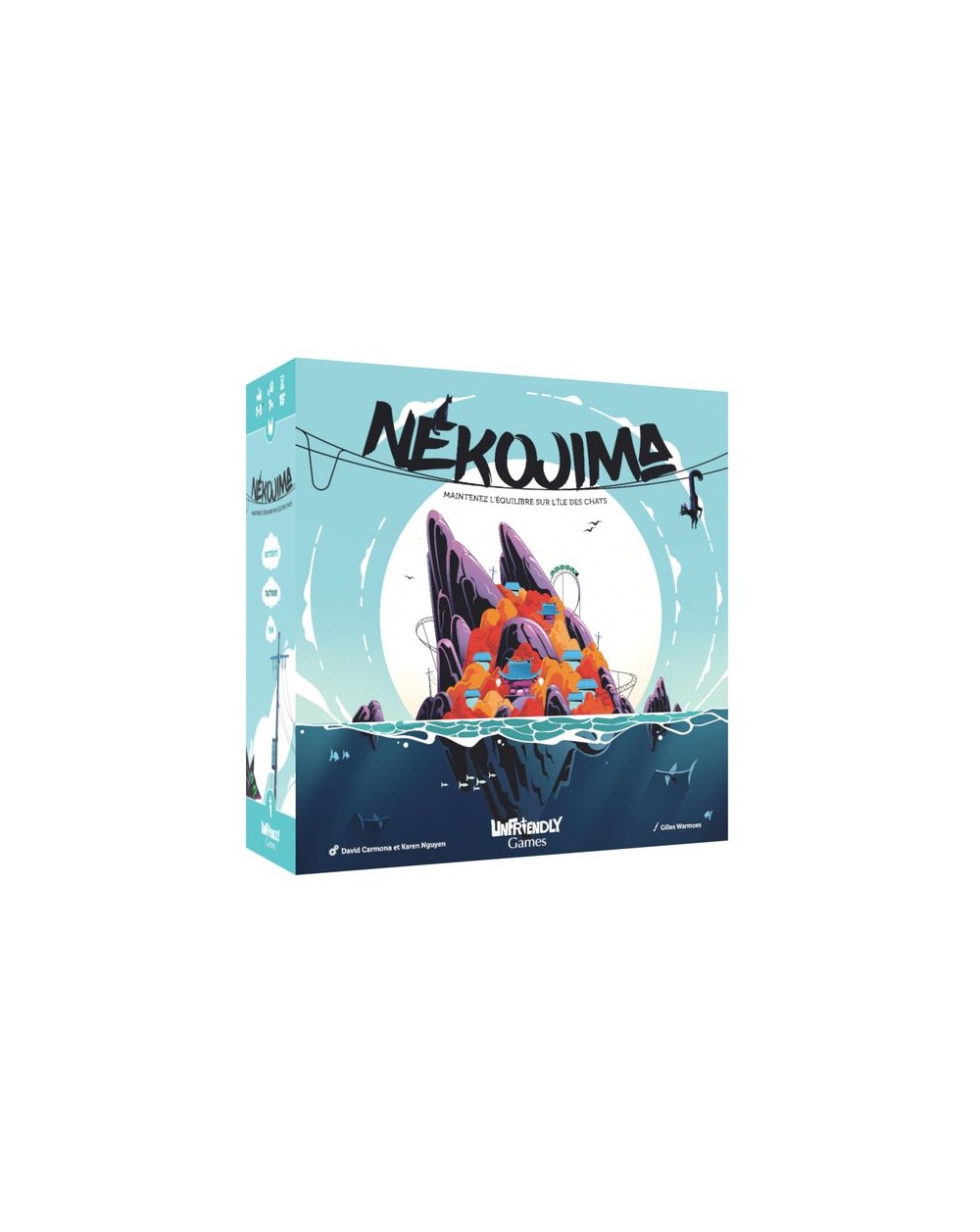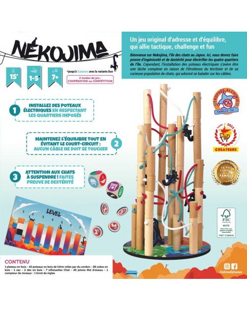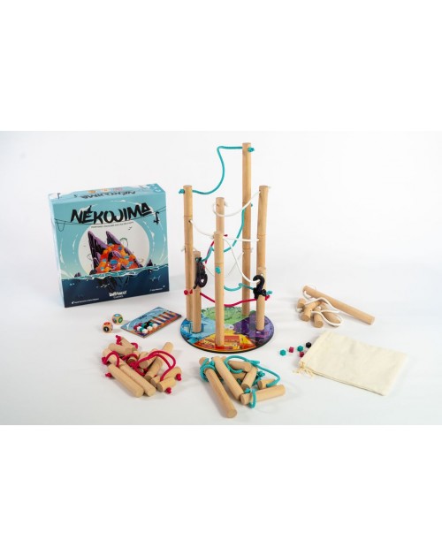 Idée du jeu : Nekojima est un jeu d'adresse en bois exigeant, qui mettra à l'épreuve votre habileté et votre sang froid. L'objectif est de maintenir en équilibre des poteaux électriques, en veillant à ce qu'aucun câble ne se touche. Mais attention vous n'aurez ni le choix de l'emplacement ni celui de leur taille. En mode compétition, celui qui fait basculer la structure est éliminé du jeu. En mode coopération, le but est de collaborer pour avancer aussi loin que possible sans que l'ensemble ne s'effondre. Il s'agit d'un défi qui sollicite à la fois de la coordination et de la précision, que vous jouiez en solo ou en équipe. Préparez-vous à mettre vos compétences à l'épreuve et à vivre des moments palpitants avec Nekojima !