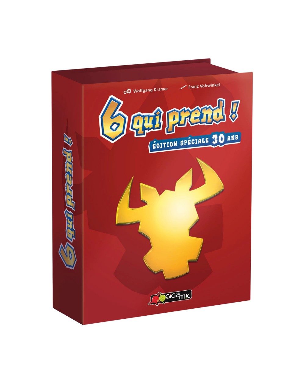 Idée du jeu : Depuis 30 ans, les fans de 6 qui prend prouvent qu'ils ne sont pas de bêtes à cornes ! Cette édition anniversaire propose le jeu de base bien connu ainsi qu'une toute nouvelle variante coopérative : affrontez le boeuf et faites-lui perdre des points à l'aide des cartes spéciales. Etes-vous de taille à le battre ? Découvrez aussi quatre cartes spéciale supplémentaires, imaginées par les fans de 6 qui prend ! pour encore plus de variété dans le jeu.