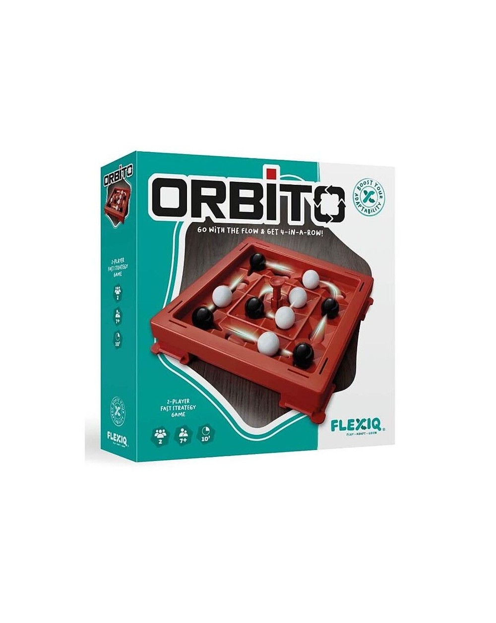 Idée du jeu : Jeu de stratégie rapide à deux joueurs avec des règles très simples. Facile à apprendre, difficile à gagner ! À tour de rôle, placez une de vos billes sur le plateau de jeu et essayez d'obtenir quatre billes de votre couleur en ligne horizontale, verticale ou diagonale sur le plateau de jeu mobile. Mais attention, vous devez appuyer sur le bouton Orbito pour terminer votre tour. Cela déplacera toutes les billes d'une position dans leur "orbite" ! Vous pouvez également contrecarrer la stratégie de votre adversaire en déplaçant une de ses billes vers une position libre adjacente pendant votre tour. Créez une rangée horizontale, verticale ou diagonale de quatre boules de votre couleur et gagnez !
