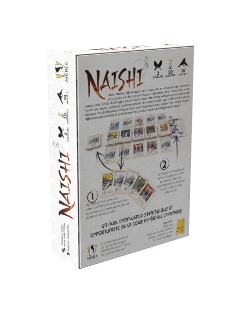 Toute la difficulté et l'esprit du jeu de cartes Naishi réside dans l'impossibilité de réorganiser librement vos cartes, ni dans votre main, ni devant vous dans votre Ligne. Gérez au mieux votre main de cartes et placez devant vous astucieusement celles-ci pour réaliser un tableau qui représente l'organisation de votre province.