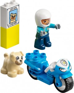Le set inclut 2 personnages LEGO DUPLO (un policier et un adorable chien), une affiche Lost Dog, ainsi qu'une superbe moto de police bleue sur laquelle le policier peut transporter le chien.