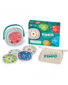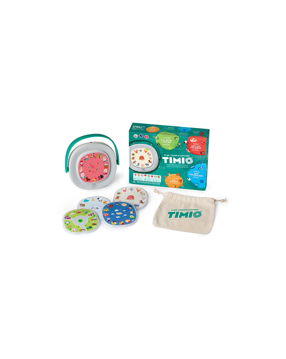 TIMIO est un lecteur audio et de musique sans écran pour les enfants de 2 à 8 ans. Contient 8 langues: néerlandais, anglais, espagnol, allemand, français, chinois, italien, portugais (Br). Contient plus de 40 heures de contenu activé par des disques magnétiques: vocabulaire, histoires, chansons, etc. L'appareil dispose d'une connexion casque, a 3 niveaux de volume et n'a pas besoin d'Internet ou du WiFi. Pour utiliser l'appareil, vous avez besoin de 3 piles AA. L'appareil s'éteint automatiquement après 10 minutes. Il y a 5 audio discs dans cette Startet Pack. Chants, petites histoires, véhicules, berceuses et animaux de la ferme.