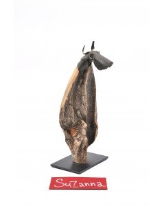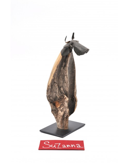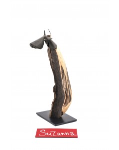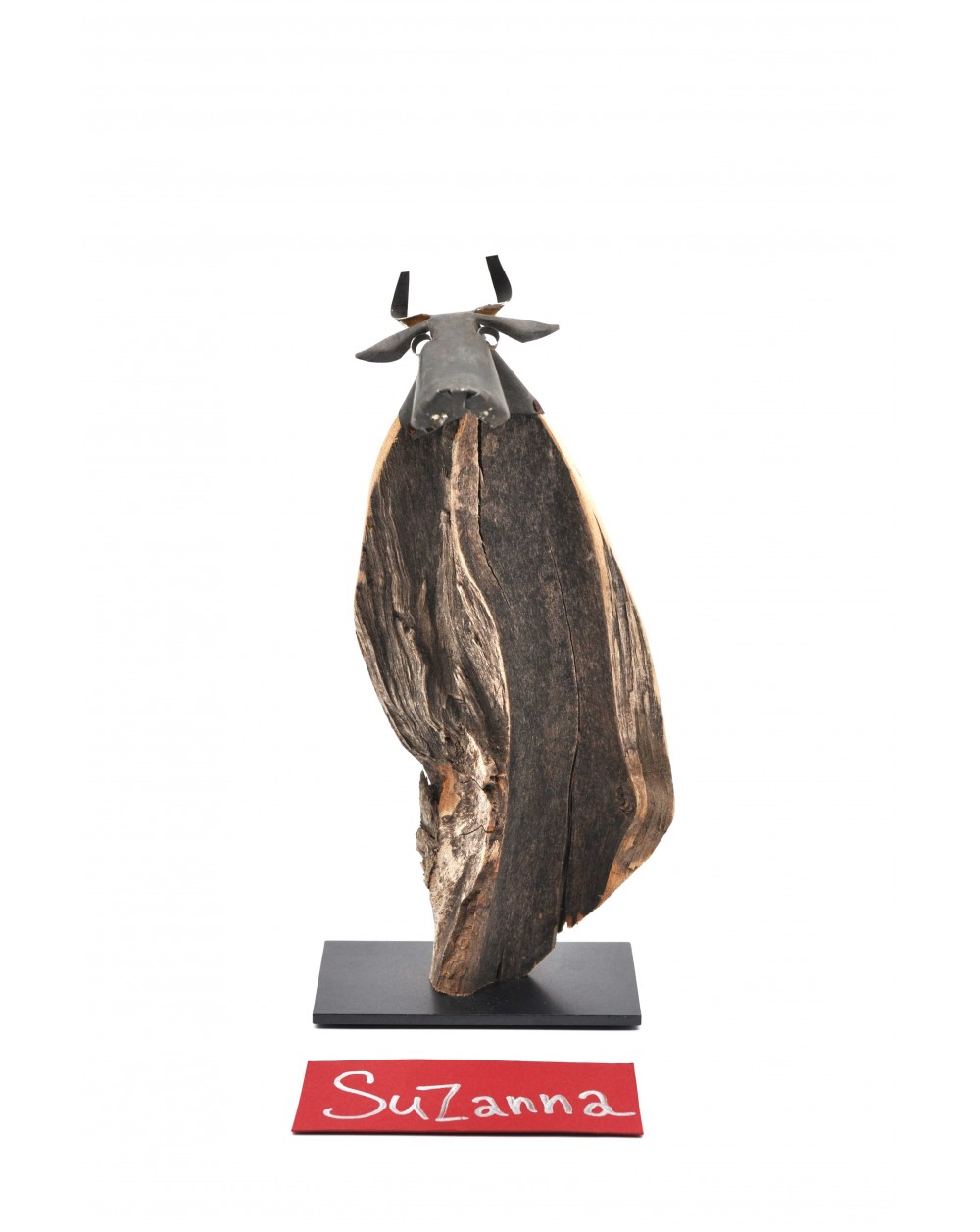 Vache corps en bois flotté, tête en tôle de récupération pliée, socle en acier.