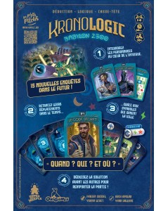 Idée du jeu : Après le succès de Kronologic : Paris 1920 et Cuzco 1450 partez dans le futur en 2500 ! Déchiffrez un code secret, identifiez des complices et remettez le temps dans l’ordre… Démêlez une série d’affaires inexpliquées et rétablissez la vérité. Récupérez des indices sur les déplacements des personnages de l’intrigue, en déterminant à quel endroit ils se trouvaient au moment des faits. Chacune des enquêtes, à la complexité variable, mettra à l’épreuve votre perspicacité et vos compétences de déduction logique. Votre objectif : résoudre chaque mystère avant les autres ! Chaque scénario est rejouable 5 fois.