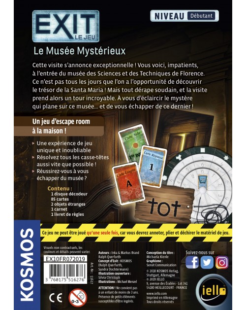 Réunissez vos amis, ouvrez une boîte d'Exit et partagez une aventure intense et haletante. Explorez attentivement les lieux et résolvez ensemble les énigmes qui vous permettront peu à peu de progresser vers la sortie. Faites preuve de concentration et d’imagination : chaque situation est unique ! Plus vous coopérerez, plus vous aurez de chances de franchir les étapes tortueuses du scénario dans le temps imparti.