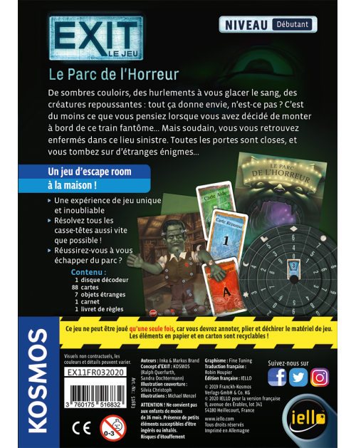 Réunissez vos amis, ouvrez une boîte d'Exit et partagez une aventure intense et haletante. Explorez attentivement les lieux et résolvez ensemble les énigmes qui vous permettront peu à peu de progresser vers la sortie. Faites preuve de concentration et d’imagination : chaque situation est unique ! Plus vous coopérerez, plus vous aurez de chances de franchir les étapes tortueuses du scénario dans le temps imparti.