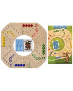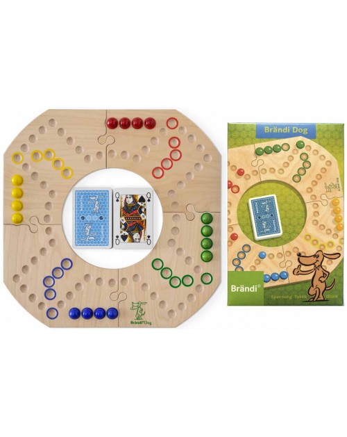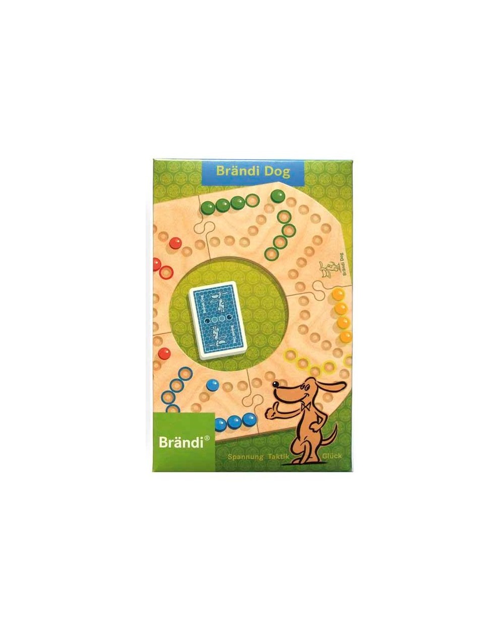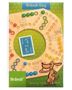 Idée du jeu : Le Brändi Dog se joue habituellement à quatre joueurs. Deux personnes forment une équipe et jouent ensemble (exception voir règles particulières pour 2, 3 et 5 joueurs). Tout comme au jeu du «Hâte-toi lentement», chaque joueur doit sortir ses pions de la niche et les conduire jusqu‘au champ d‘arrivée en partant de la case départ. Ce jeu est bien plus passionnant en ceci qu‘il n‘y a pas que la chance qui compte, il requiert aussi une bonne tactique et une bonne stratégie. Pendant la partie, les joueurs se soutiennent mutuellement et se font renvoyer à la niche par leurs adversaires. Les pions avancent en fonction de la valeur des cartes jouées. Il est possible qu‘un seul joueur gagne. Lorsqu‘un joueur a mis tous ses pions sur le champ d‘arrivée, il aide son partenaire à en faire de même. L‘équipe gagnante est celle qui parvient à conduire ses huit pions au champ d‘arrivée.